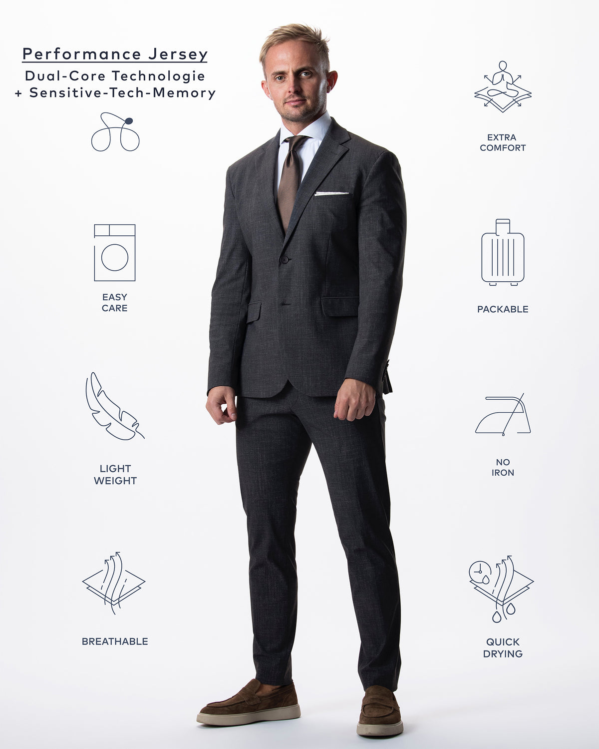 Die Modelle verbinden eine moderne Passform mit Bewegungsfreiheit, damit du dich im Büro, auf Terminen oder unterwegs wohl fühlst. Der Stoff trägt sich angenehm und ist auf unkomplizierte Pflege ausgelegt. So eignet sich der Anzug für lange Tage ohne viel Aufwand. Er knittert nicht und behält immer die perfekte Form ohne auszuleiern. Ein bequemes Slim Fit Sakko, das dich immer gut aussehen und fühlen lässt.